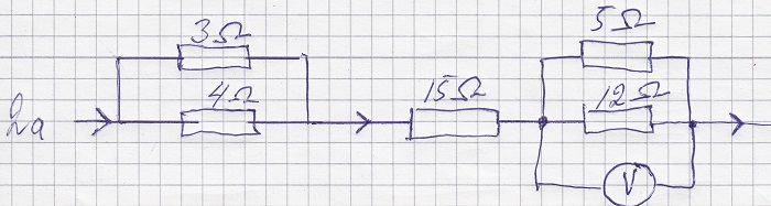 så flyter även 2A till höger om resistanserna och därmed också genom 15 ohmsresistansen. Voltmetern är inkopplad parallelt över båda motstånden så den resulterande resistansen blir båda motstånden parallellt. 3,53 ohm. Multiplicera med 2A och du får 7,06V.